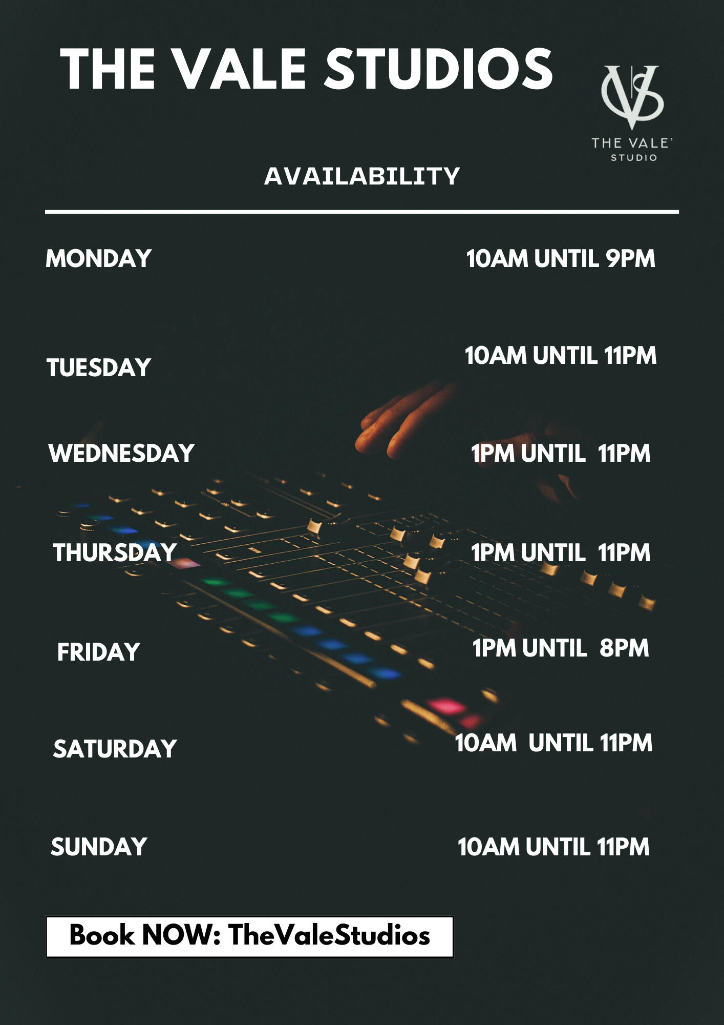 Find your perfect time slot for a session with our in house producer for all your musical needs.
